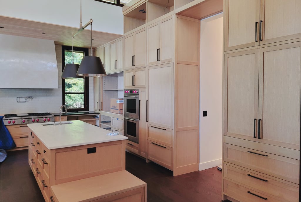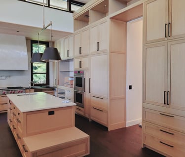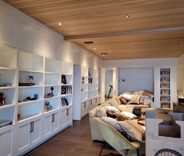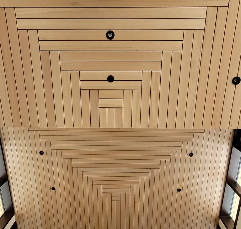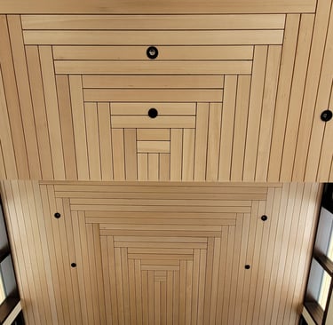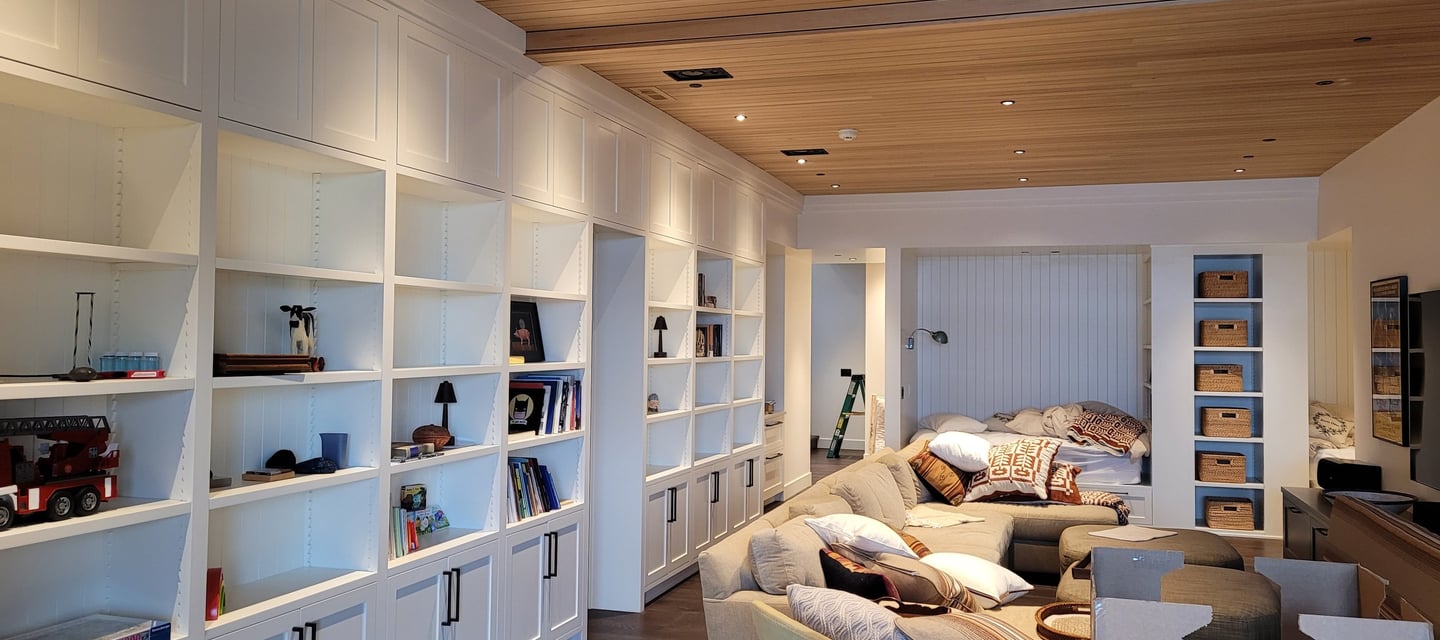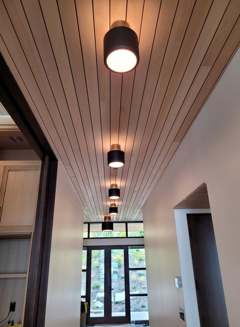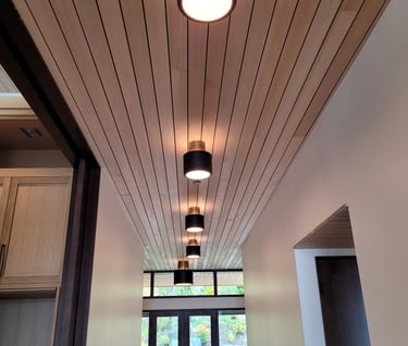 Much of the challenge of this project was the complexity and breadth of the ceiling work that was entailed and the wrap-around design of the main floor that required sight lines to flow from inside the house to the exterior wrap-around soffits. The final project came out beautifully and our shoulders have since recovered.